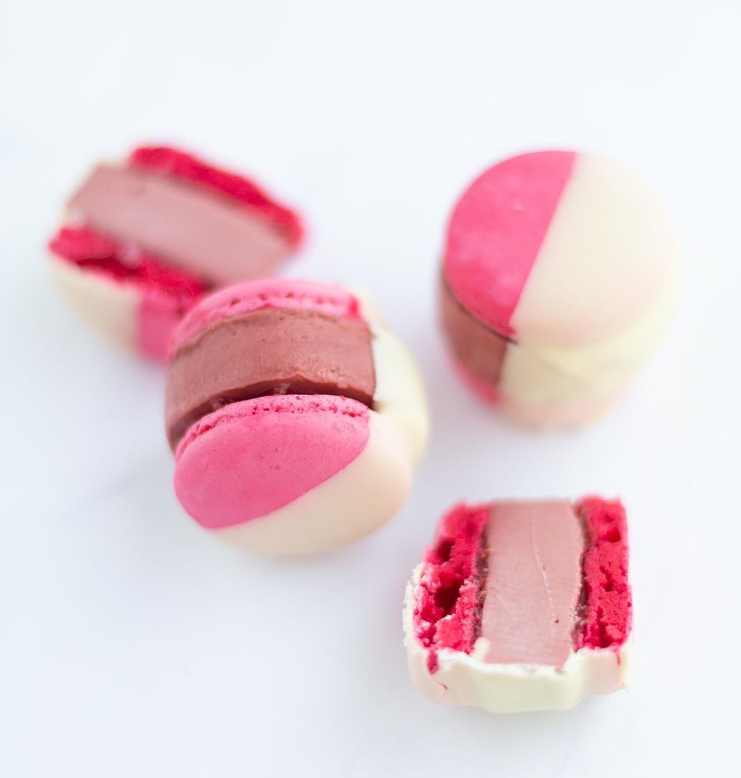 Abright pink macaron, filled with Raspberry Compote & Red Velvet Cake Batter Ice Cream, dipped in White Chocolate.